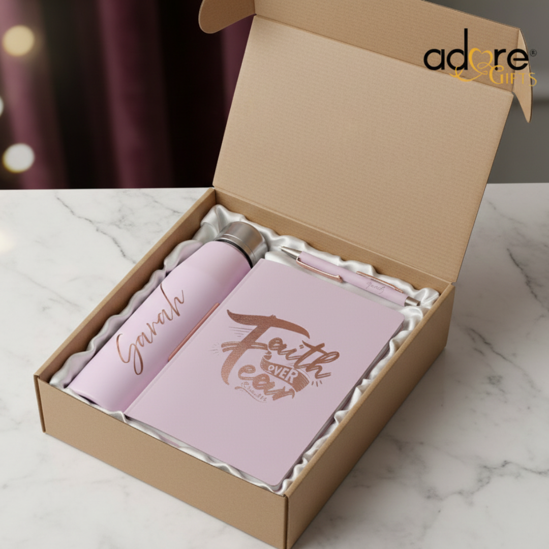 Make your gifting unforgettable with this elegant engraved set, featuring a sleek aluminium water bottle, soft cover notebook, and stylish ball pen, all presented in a chic kraft board gift box. Engraving can be added to the bottle, notebook, and pen for a truly personalised touch.
